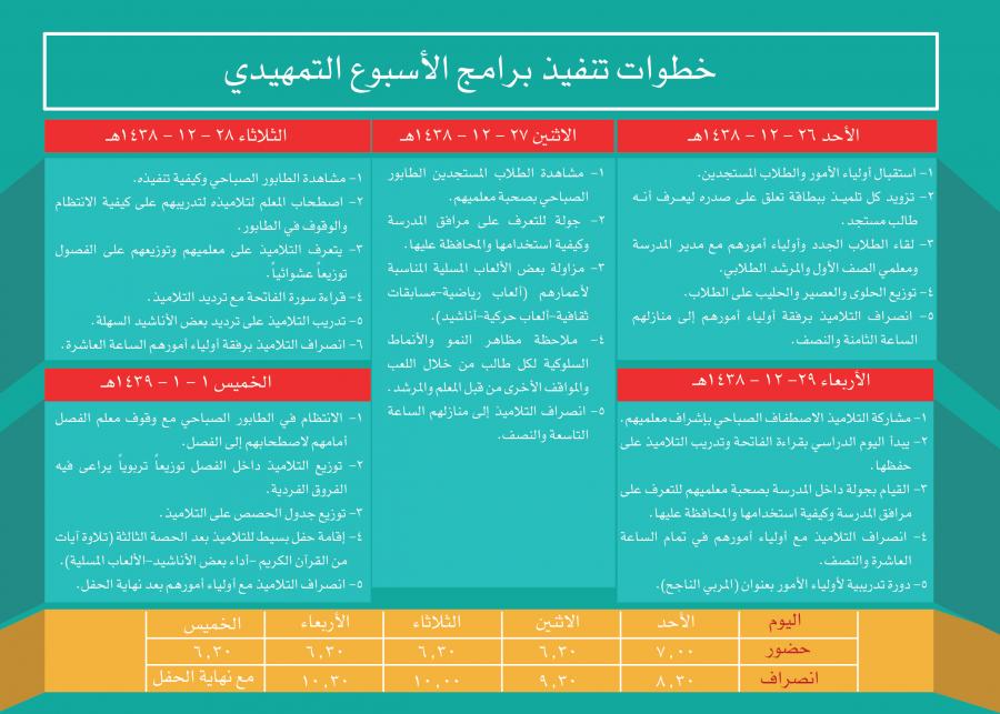 نرحب بأولياء أمور الطلاب الكرام للصف الأول الابتدائي في الأسبوع التمهيدي، ابتداءً من يوم الأحد تاريخ: 26-12-1438هـ وحتى الخميس: 1-1-1439هـ