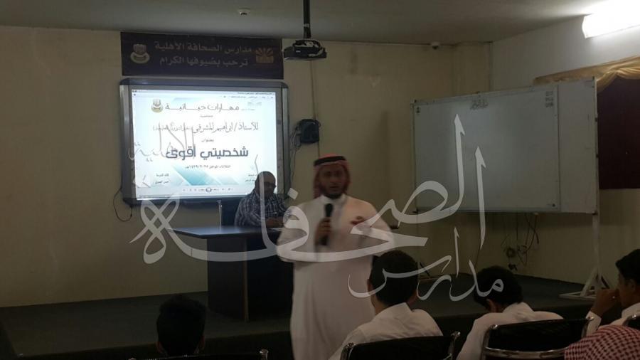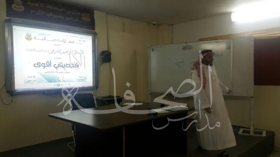 ضمن برنامج المهارات الحياتية لطلاب المرحلة الثانوية بهدف تنمية ثقافة الطالب بقدرتِه على التعاملِ بنجاحٍ مع متغيراتِ الحياة المختلفة؛ قام الأستاذ/ إبراهيم المشرقي مدير الشؤون التعليمية بالمدارس، بإلقاء محاضرة للطلاب بعنوان (شخصيتي أقوى)، وذلك يوم الثلاثاء الموافق 24-2-1439هـ.