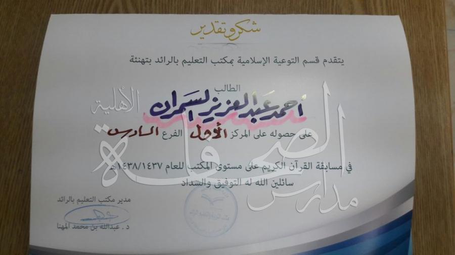 فاز الطالب/ أحمد عبدالعزيز السمران بمتوسطة الصحافة الأهلية بالمركز الأول في مسابقة القران الكريم على مستوى مكتب الرائد (الفرع السادس)