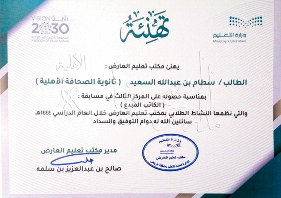مكتب تعليم العارض يكرم الطالب / سطام بن عبدالله السعيد