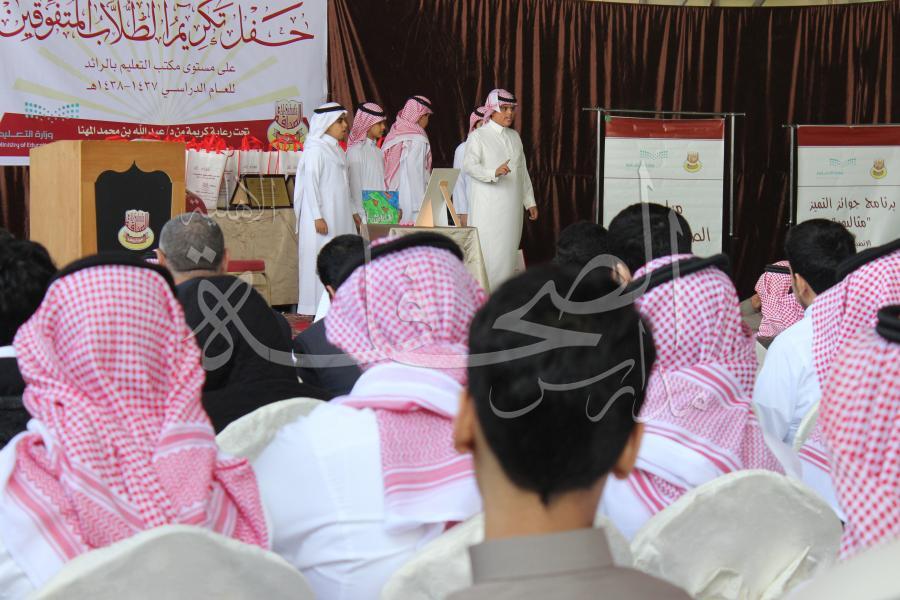 وفي الختام قام الدكتور عبد الله بن محمد المهنا مدير مكتب التعليم بالرائد بتسليم الشهادات والهدايا على الطلاب المتفوقين.