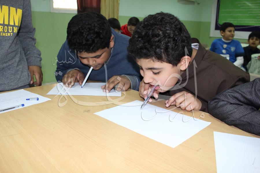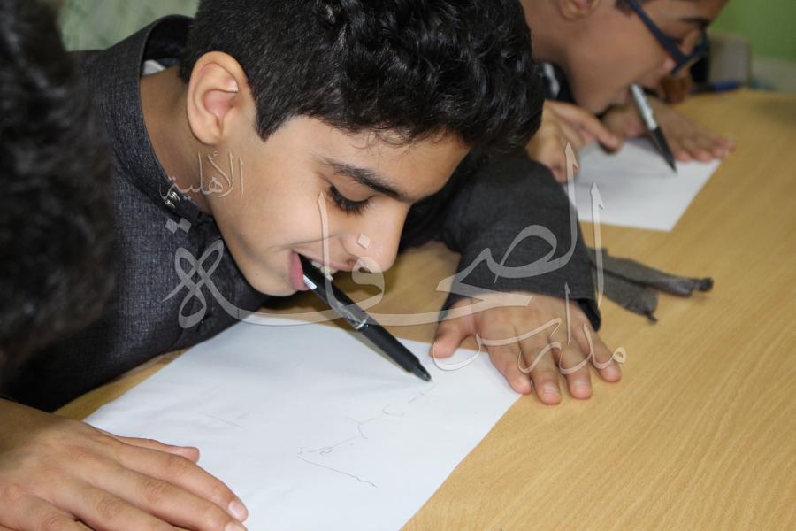قامت أسرة اللغة العربية بالقسم الابتدائي (الصفوف العلوية) بإجراء مسابقة بين طلاب الصفوف (الرابع  والخامس  والسادس) في مهارة الكتابة بالفم، وذلك في جو من المتعة والمنافسة بين الطلاب لإظهار مهاراتهم وقدراتهم على التحكم بالقلم من خلال الفم.