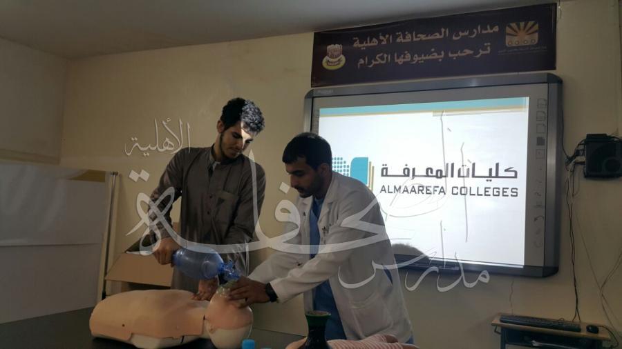 قامت كليات المعرفة بالتنسيق مع المدرسة لتنظيم دورة للطلاب في الإسعافات الأولية، قدم الدورة أطباء متخصصين، وقد كانت الدورة لمدة يومين، حيث بدأت الثلاثاء الموافق 17-5-1438 هـ، وحتى يوم الأربعاء الموافق178-5-1438هـ .