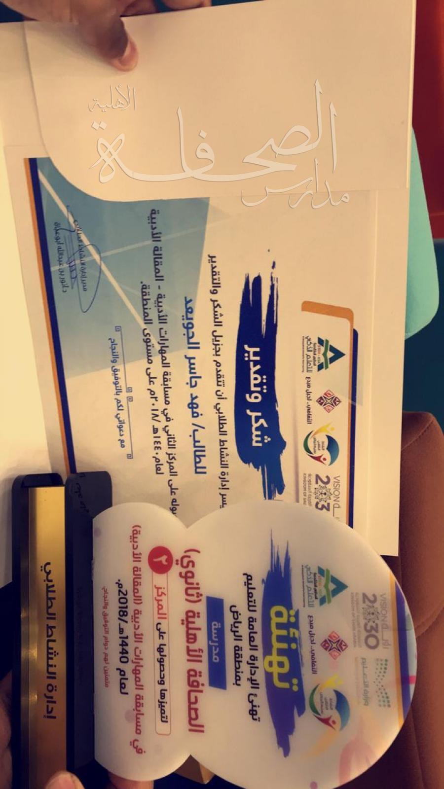 تكريم الطالب / فهد جاسر الجويعد الفائز في مسابقة المهارات الأدبية ( فرع المقالة الأدبية )، بالمركز الثاني على مستوى إدارة تعليم الرياض، حيث تم تكريم الطالب من سعادة الدكتور/ أنور أبو عباة مدير النشاط الطلابي بإدارة تعليم الرياض، وذلك يوم الثلاثاء الموافق 19-3-1440هـ.