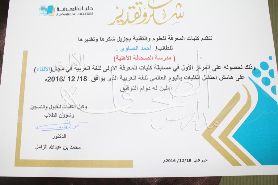 شارك طلاب ثانوية الصحافة في مسابقة الشعر العربي الفصيح والقصة القصيرة، والتي أقيمت في كليات المعرفة بمناسبة الاحتفاء باليوم العالمي للغة العربية، يوم الخميس الموافق 23-3-1438 هـ، وقد حصل الطالب/ أحمد مصطفى صاوي على المركز الأول في (إلقاء الشعر الفصيح )، كما حصل الطالب/ أحمد طارق الغريني على المركز الثالث في مجال (نظم القصيد).