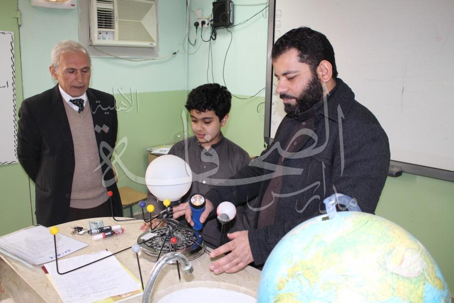قدم الأستاذ/ محمود عبد العزيز بحضور المشرف المقيم، والأستاذ/ مجاهد الهجوة درساً تطبيقياً، طبق فيه بعض استراتيجيات التعلم النشط (الدقيقة الواحدة-العصف الذهني-الاستقراء)، مستخدماً السبورة الذكية، ونموذجاً عن المجموعة الشمسية، وفيديو عن حركة الكواكب، والنيازك والشهب، وتم تقييم الطلاب من خلال أوراق عمل حُلت من قبل الطلاب.