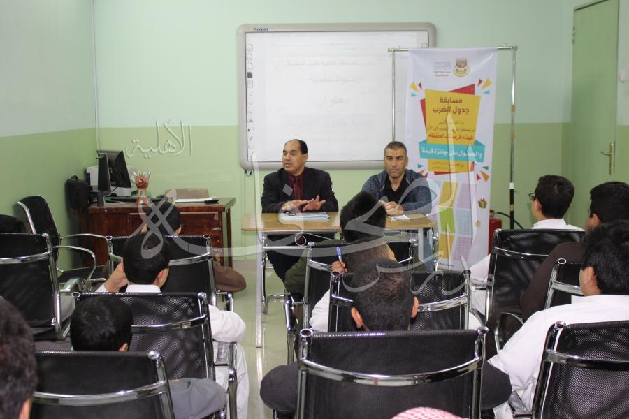 قامت فرقة الرياضيات بالتعاون مع المشرف التربوي الأستاذ/ محمود هلال بتفيذ ندوة علمية لتعريف الطلاب بمدى أهمية جدول الضرب بالنسبة للمرحلة المتوسطة، والتعرف على الصعوبات التي تواجههم في حفظ جدول الضرب.