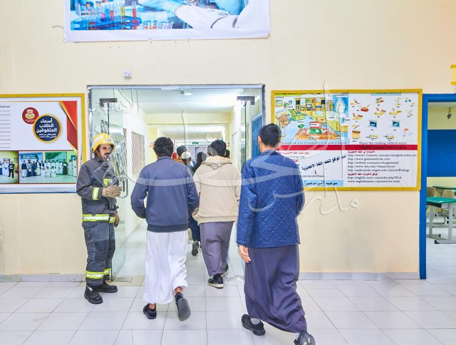 خطة الإخلاء المطبقة في ثانوية الصحافة بإشراف مكتب العارض ومركز الدفاع المدني